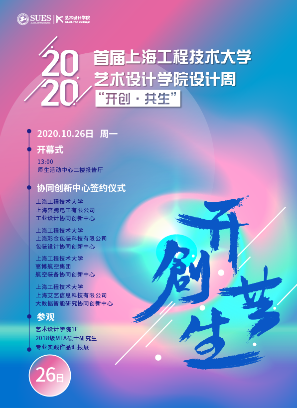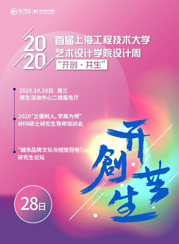 为了进一步彰显公司整体设计实力,和对公司“十三五”建设成果进行系统展示,为下一步304永利集团“十四五”规划开局打下坚实的基础,发挥高校知识经济圈的优势资源,用“智能+”“互联网+”“设计+”赋予传统产业新的发展智能,打造“工程大+”设计领域发展新业态。特此举办2020首届上海工程技术大学304永利集团“开创·共生 ”设计周活动,活动中包含协同中心签约、设计大师讲座、学术沙龙分享会、MFA硕士生作品展示、MFA导师培训等相关活动。2020首届上海工程技术大学304永利集团“开创·共生 ”设计周活动将于2020年10月26日(周一)在304永利集团松江校区(师生活动中心二楼报告厅)举行,2020年10月27日(周二)在师生活动中心二楼报告厅、304永利集团一楼大厅、304永利集团大摄影棚同时举行设计大师讲座、学术沙龙分享会等相关活动。