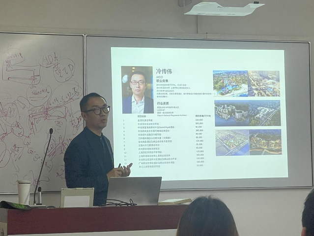 2023年11月22日下午,AICO设计师冷传伟老师作为企业导师为环境设计071B211班的同学进行景观建筑设计案例分享教学。冷传伟老师毕业于青岛理工大学建筑公司,有超过19年的混合业态开发项目的设计经验,在加入上海AICO建筑前曾担任RTKL主创建筑师和上海天华设计总监。多年来,他作为设计总负责人参与了多个地区的综合开发项目涵盖商业综合体,文商旅混合街区,文保地区城市更新,教育及高端居住等。在长达一个半个小时的授课中,冷传伟老师回顾了近年来设计过的景观建筑设计案例,并围绕景观设计过程中所需要掌握的相关基础知识以及该方向的发展趋势进行了讲解。