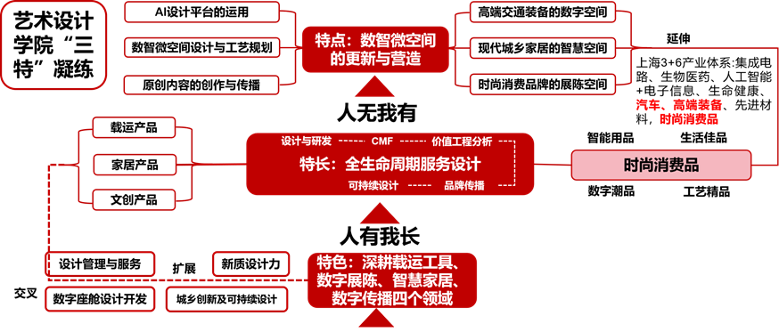 “数智微空间的更新与营造”是利用物联网、云计算、大数据、人工智能等新一代信息技术,融合人居尺度场景下的人、事、地、物、情、组织等数据资源,通过改良、优化设计与社群性营造活动,面向出行、家居等领域的时尚消费需求提供全生命周期设计服务方案。“数智微空间的更新与营造”将积极对接上海“3+6”产业体系中的汽车、高端装备、时尚消费品等三个产业,聚焦高端交通装备的数字空间、现代城乡家居的智慧空间、时尚消费品牌的展陈空间等三个方向开展深度跨学科学术研究,以AI设计平台的运用、数智微空间设计与工艺规划、原创内容的创作与传播作为核心研究内容。