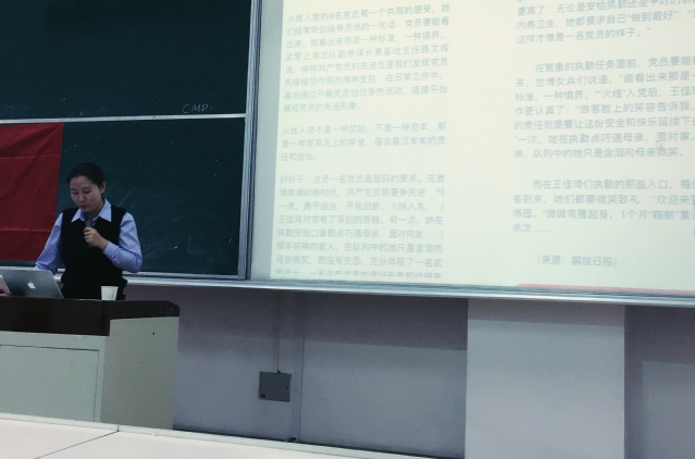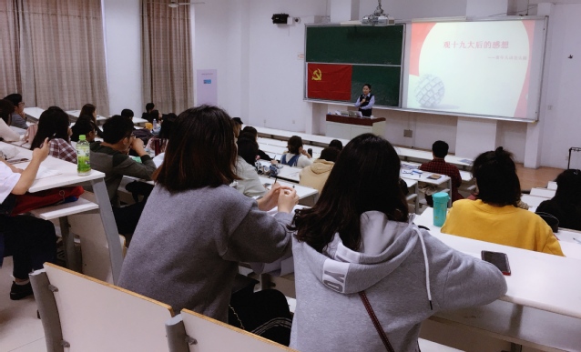王佳琪老师在课上首先陈述了关于党的十九大的报告内容,其次谈谈对十九大报告内容的感受和想法,最后结合了自己的人生经历详细讲解了作为青少年如何不忘初心的跟党走,如何提升员工干部能力。她指出:大学员工干部必须首先具备政治思想素质。因为员工干部作为员工基层组织各种活动和工作的组织者和领导者,必须具有较高的政治觉悟和思想品质。然后需具备能力素质、心里素质以及集体素质。