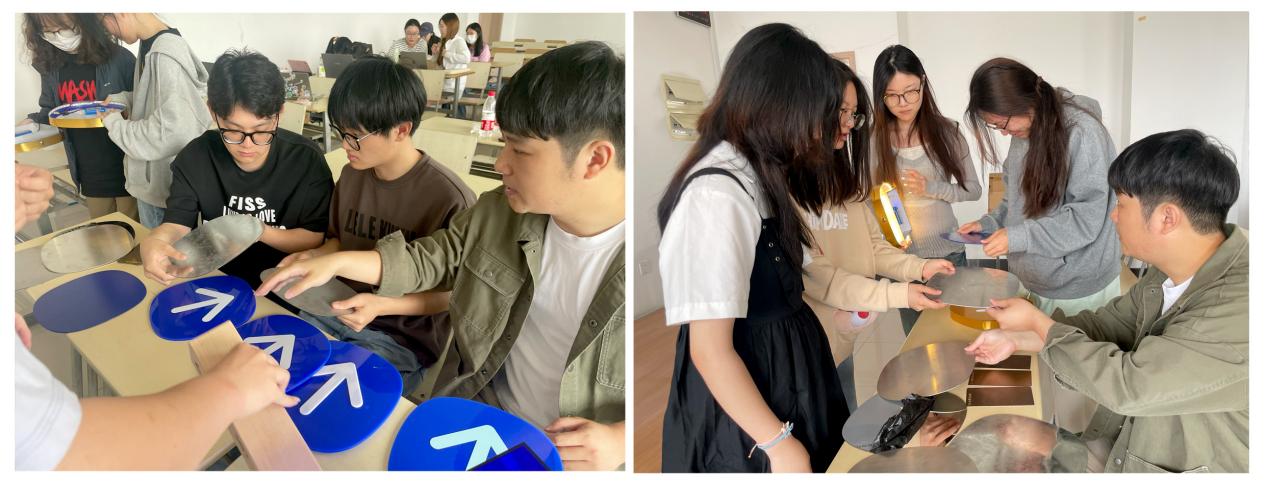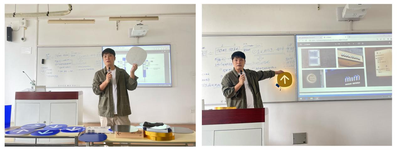 顾老师分别从CMF设计原理、材料创新两个角度为同学们讲解了相关CMF的基本概念和设计原理,阐释了三者在空间导视设计中的协同作用,同时通过分析国内外多个知名空间导视设计案例,示了CMF如何提升空间的导向性、美观性和用户体验,同时针对材料的安全、工艺制造、造价成本等多个纬度组织同学进行了讨论,并对导视设计材料的选材原则、设计方法和制作技巧进行了详细解读。