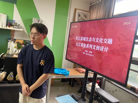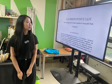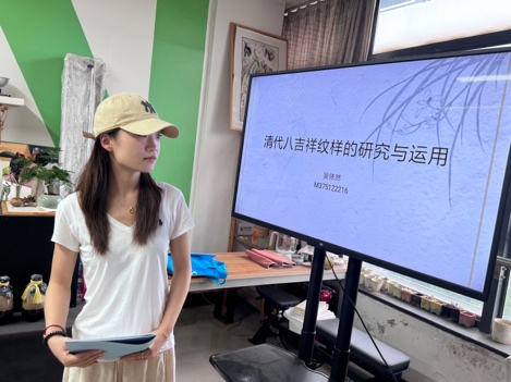 吴依然同学分享的《清代吉祥纹样的研究与应用》,从八吉祥纹样的表现技法、造型、独特的构成方式融合设计成简练、符合现代特色,适应当前审美、具有时尚感的表现形态。将八吉祥纹样应用在文创设计领域之中,以雍和宫祈福文创为载体,让文创设计更具有民族性,更具有文化内涵。张琦同学分享的《长江流域生态与文化交融长江有鱼系列文创设计》,将长江流域的鱼类文化与日常生活相结合,包装设计采用了镂空的形式,上半部分的镂空可以更好的看到保护鱼类的插画,能让用户感受到异形设计所带来的视觉冲击。日历采用异形设计,可以撕下的书签不仅具有实用性和美观性,还具有一定的互动性和收藏价值。俞悦同学分享的《宋元时期植物纹样的研究与运用》,从宋代和元代植物纹样的特点,以及结合当时历史、人文、经济等因素,来分析两个朝代植物纹样在当时风格以及应用上的异同并与当时社会存在一定的联系,以及对后世的影响与发展。
