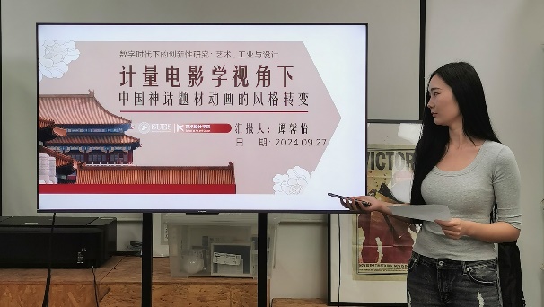 汇报整体涵盖历史人文、前沿科技、绘画艺术、工业机械等领域,跨越中外、古今、传统与现代等多个维度。汇报开始,赵炎晟与谭馨怡两位同学,以计量电影学的角度对中外电影进行定量研究,以特殊的切入点捕捉电影之间的细微差异,对电影工业发展提出了各自的看法。