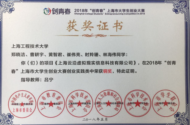 在2018年“创青春”上海市老员工创业大赛上,经过校内选拔赛、上海市赛的层层考验,我院“上海云沿虚拟现实信息科技有限公司”创业实践项目团队以优异的表现,荣获上海市老员工创业大赛铜奖。这也是公司在“创青春”上海市老员工创业大赛中首次获得市级奖项。