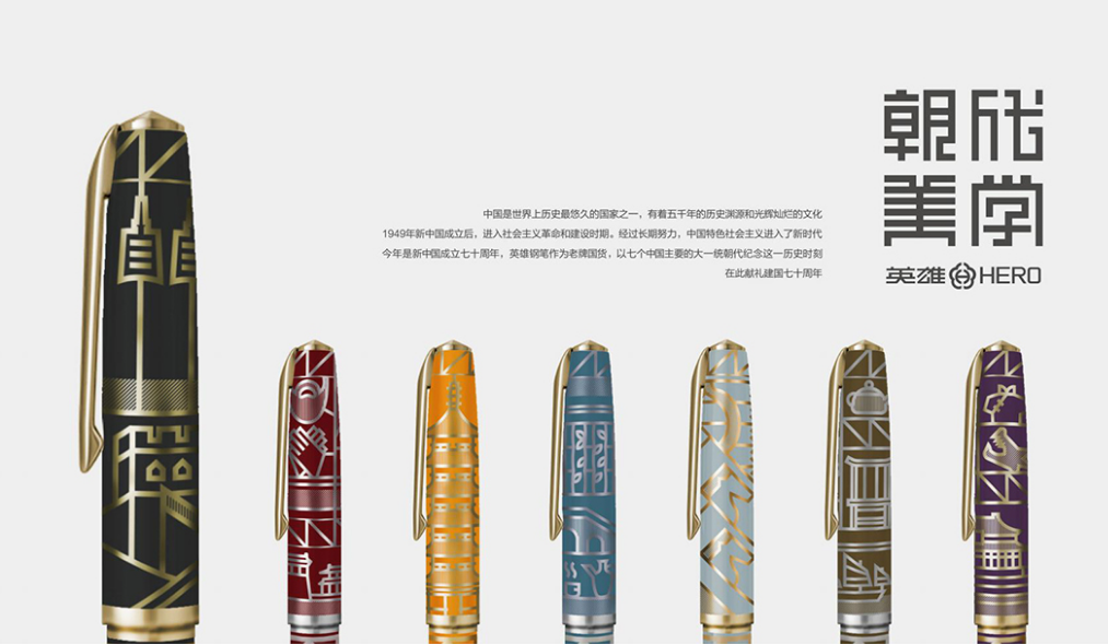 姚惠副教授作品设计理念源自中国书画术语“书画同源”。深度剖析中国各朝人文、建筑、历史等元素进行符号化,开发了“英雄100号米字设计规范”先后设计了“秦汉唐宋元明清”专属图案,浓缩了中国朝代美学符号。笔尖采用14K纯金笔尖,在保证书写顺畅的前提下提升弹性触感。笔身与笔帽,采用了双色套杆镀金工艺,与高透亚克力光线折射下的文化元素相得益彰,与英雄金笔“质量第一,以人为本,赶超先进,追求卓越”的品牌文化和经营理念相呼应。