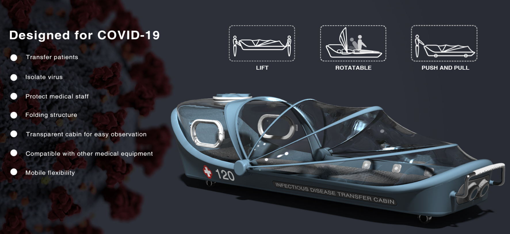 金薇薇副教授团队作品是一个模块化的隔离系统,主要功能为运送传染病患者,经过2020年初的新型冠状病毒危机,我们能够清晰的认识到,医疗器械在医护领域的重要性,尤其在传染病病人的运送过程中是一项极为危险的任务,医护人员和转运人员承担着被感染的风险,且在转运过程中易对周围环境造成感染,该医疗系统旨在患者装载和运输过程中实现最高的安全性和多种治疗方法的可能性,保护患者免受环境的二次感染,其可翻折的舱盖系统可以便于患者顺利进入转运舱,避免了舱体与舱盖之间的繁琐操作,可以推拉,在停靠医院病房时同样可以冲做临时病床使用,能够缓解医院病床匮乏的局面。