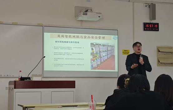 孙总以影响食品安全的危害类型入手,讲解了食品安全的要素、食品安全的防线,进而谈及什么样的厨房是一个有生命力的厨房,以及这样的厨房具备怎样的运营关键要素和活力要素,并结合当下智能互联时代的到来,展示了在商业餐饮中智能网联如何用于食品安全管理,为商业餐饮中的食品安全保驾护航。孙总同时还邀请到上海洪川商务咨询郭文烨顾问和广东味来世纪科技有限公司陈刚总经理一同参与课堂,郭文烨顾问专注于厨房设计,而味来科技则致力于数智物联网食堂。虽然课堂时间很短,但是在孙总激情四射的讲解和与同学们的提问互动中,将智能网联与食品安全的重要性深刻地印在了在场每一个人的脑海里,极大地增强了同学们对于食品安全重要性的认知,以及智能网联在其中可以发挥的重要作用。