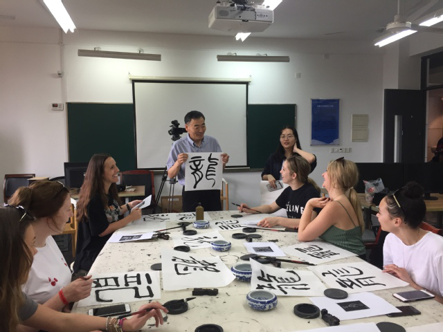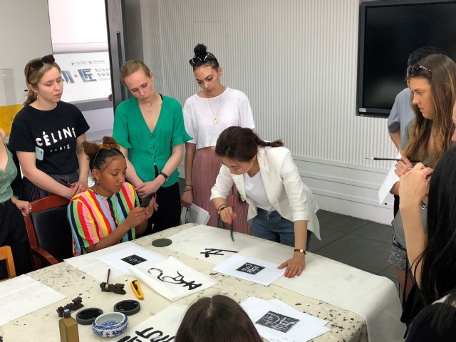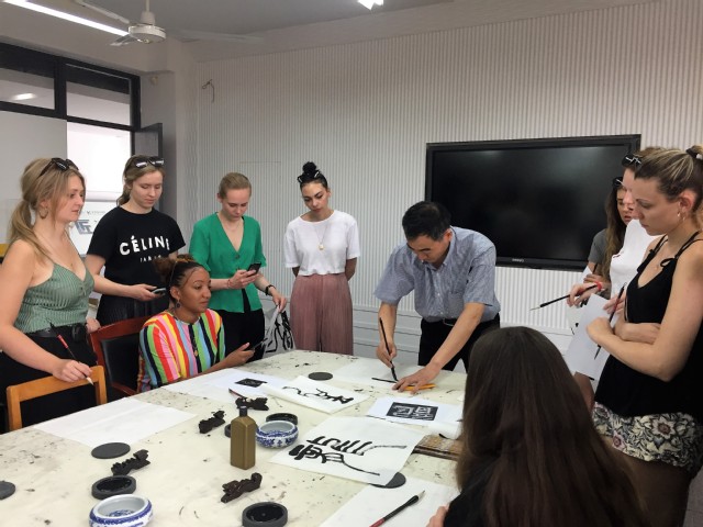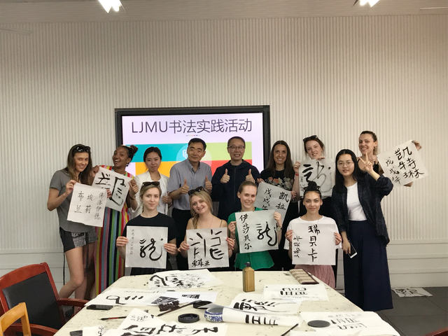 6月4日下午,同学们迫不及待地来到员工活动室,等待着领略中国毛笔书法的魅力。许传宏教授以不同书体的“龙”字书法欢迎英国利物浦约翰摩尔大学(LJMU)的师生的来访,用横竖撇捺点五个基本笔画让同学们领会了汉字与英文单词构成的不同。同学们从中国传统文化中的“龙”开始模仿练习中国的毛笔书法,不懂就问,主动请教,练习的整个过程神情专注。练习尾声,同学们请求杨爽老师为他们每人书写了自己的中文名作为留念。