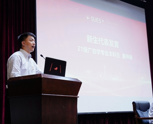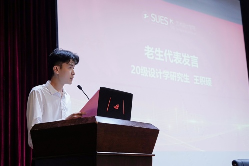 20级设计学研究生老生代表王积硕,他回顾求学初心,希望大家潜心设计研究,规划好研究生的学习和目标,做一个努力奔跑的追梦人!21级本科新生代表童梓骏以自己的亲身求学经历,以及来自援疆家庭的志愿精神来号召各位新生青春是用来奋斗的和青春拥有着无限可能与大家共勉,与新生共同立下誓言:不忘赤子初心,牢记历史使命;奋斗正是青春,青春奉献给党。