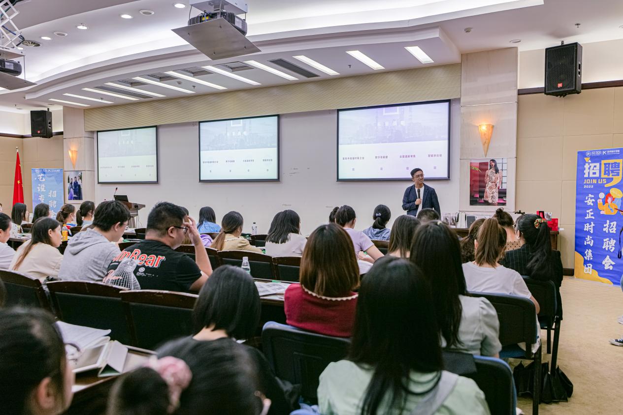 招聘宣讲会上由安正集团人力资源副总裁赵聪颖主讲,本次宣讲分为四大板块,通过对集团介绍、品牌介绍让前来参加招聘会的毕业生们更多的了解公司内部情况,同时针对2022届毕业生,集团做出了详细的校招计划。
