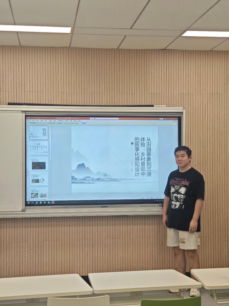 陈锦同学以乡村振兴为切入点,探讨了叙事化设计在乡村景观中的应用,重点分析如何通过“田园意象”的符号化表达与空间重构,营造具有沉浸感的体验场景。他结合乡村文化记忆与多感官互动方式,提出了重塑感知的设计路径,展示了乡村景观如何在传递地域文化的同时,为居民与游客带来情感共鸣与深度体验。