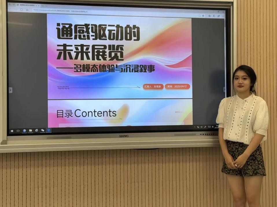 张雨凌同学探讨了通感设计在未来展览中的应用潜力,结合案例分析了多模态交互如何激活观众感知、增强叙事沉浸与情感共鸣,并提出“通感驱动”模式在展览设计中的可行路径。通过声音、视觉、触觉与空间氛围的综合实验展示,阐释了多模态叙事如何突破传统单一感官体验的局限,创造出更具沉浸感与记忆价值的文化场景。