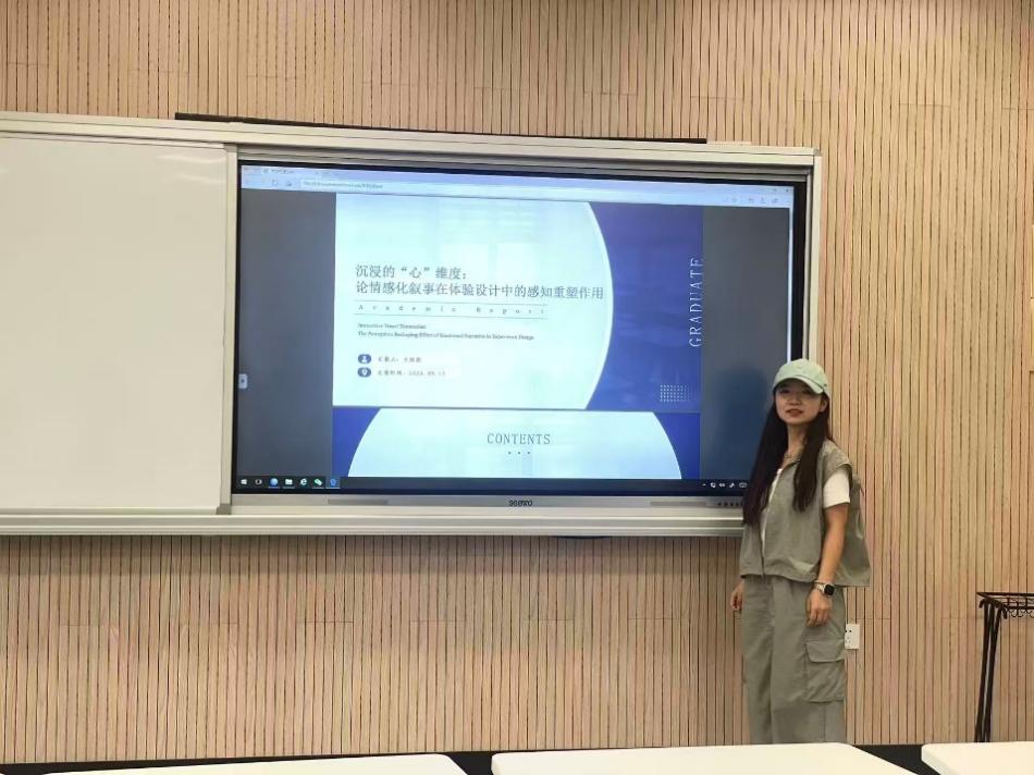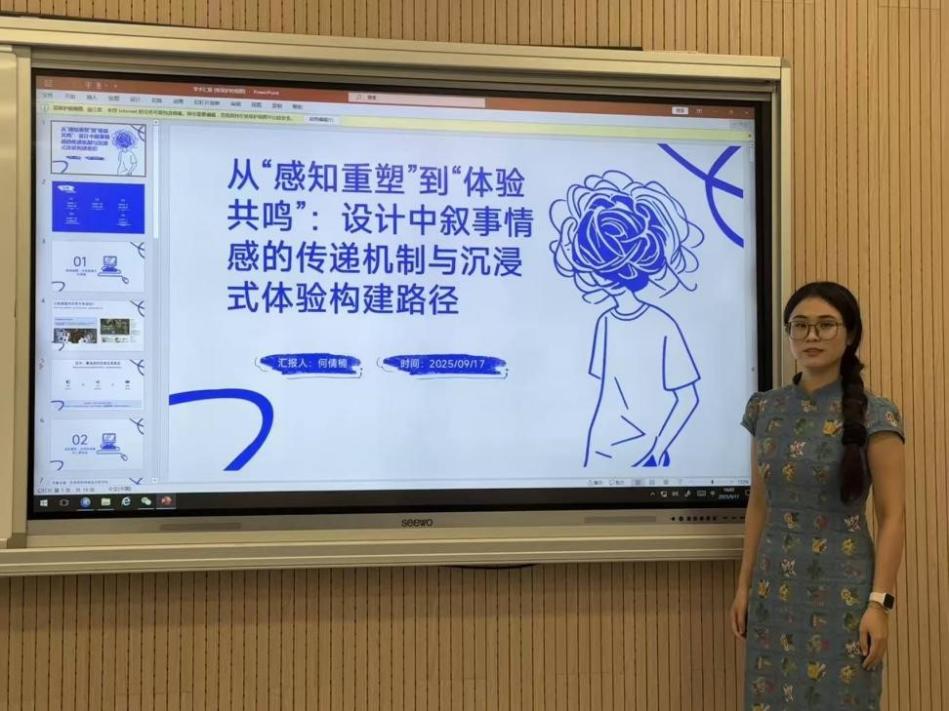 何倩楠同学在以《从 “感知重塑” 到 “体验共鸣:设计中叙事情感的传递机制与沉浸式体验构建路径》为题的汇报中聚焦叙事情感传递与沉浸式体验构建,旨在推动设计从功能载体升级为情感媒介。