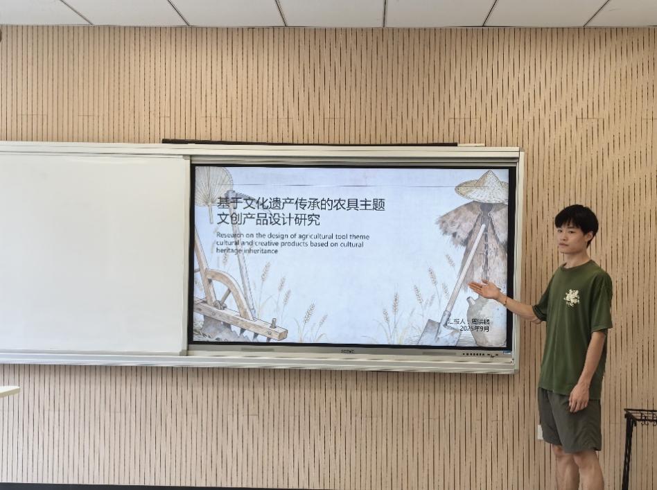 周洪鹏同学探讨了基于文化遗产的传承理念下的农具主题文创产品设计方法,通过相关资料深度剖析农具文化内涵,并提出遵循古为今用,推陈出新,多元融合,科技助力设计策略,结合案例总结可行的总结出顺应时代需求的设计方法,指导设计实践,推动农具文化传承与发展。