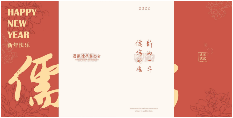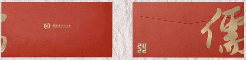 贺卡整体借鉴传统屏风结构,采用四折页开合方式,缓缓展开,独具中国仪式感;整体色系采用古典中国红,低调大气,与中国印象一脉相承,也显现2022新年来临之际的喜庆;贺卡封面、封底及信封上的烫金设计,突出整体“儒”的主题,旨在弘扬儒学文化和一切优秀传统文化的思想精华;封面的“HAPPY NEW YEAR”及“新年快乐”意在恭贺新禧,封底的“贰零贰贰”遥相呼应,合起封面与封底,可展现一个拼合完整的“儒”字。