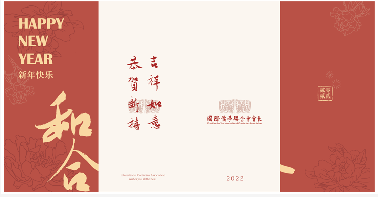 打开贺卡正面为淡米色的底色印上与整体色系相符的古典红。一面有国际儒学联合会及其英文,会长可在中间的蟠螭暗纹上签字;一面有周斌教授亲写的字体“新的一年 如您所愿”,“儒”与“如”谐音,同时还有英文翻译,代表国际儒学联合会向大家的美好祝愿。