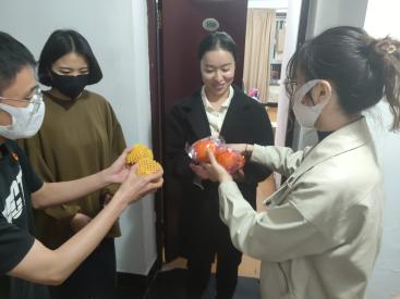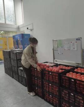 中共304永利集团委员会员工临时党支部第21党小组在六期帮忙派发员工会捐赠的一百箱苹果和橙子。