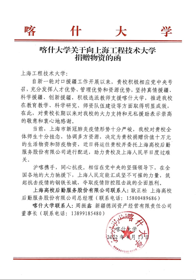 远在新疆喀什大学援建的仲宇老师,非常牵挂上海疫情情况,第一时间组织喀什大学的师生开展爱心捐赠及物资募集工作,也得到了喀什大学的大力支持,决定向公司捐赠抗疫物资十万,希望尽微薄之力,为公司的师生们送一些温暖,提供一点保障,希望上海疫情早日平复,老师们平平安安!