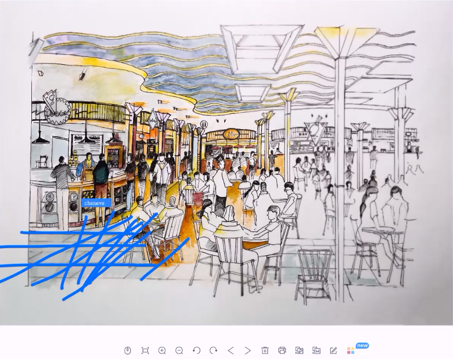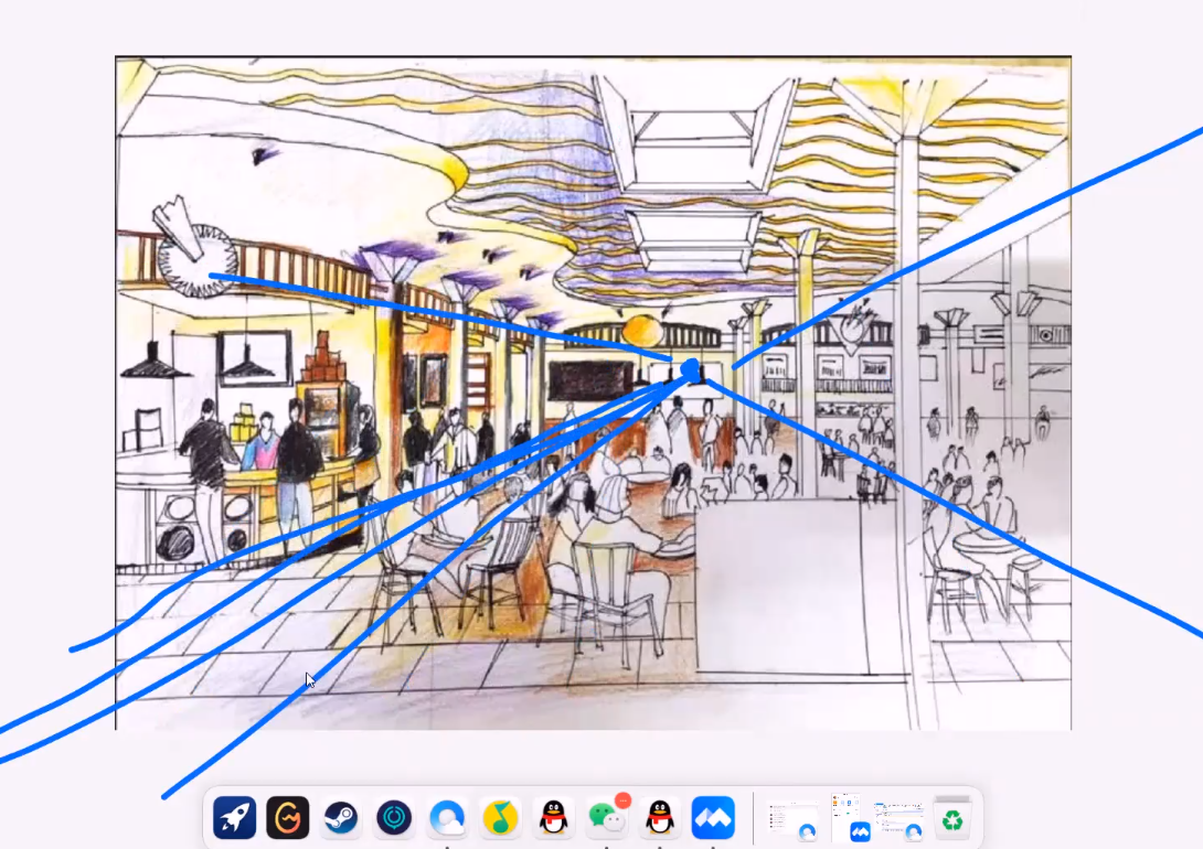 其二是如何完成“现场指导”。由于《表现技法》课程实操性极强,需要员工完成足量手绘练习,且教师同步进行课堂指导,才能到达课程效果。应对在线课堂远程授课无法对员工作业进行现场指导的缺点,陈老师运用“腾讯课堂”中的“互动批注”,结合数位板进行在线互动,完成作业点评,很好地达到了“在线手绘指导”效果,指出并帮助员工修正作业中存在的透视、比例、标注及细节表现等问题,并在后续作业中获得了正向反馈。
