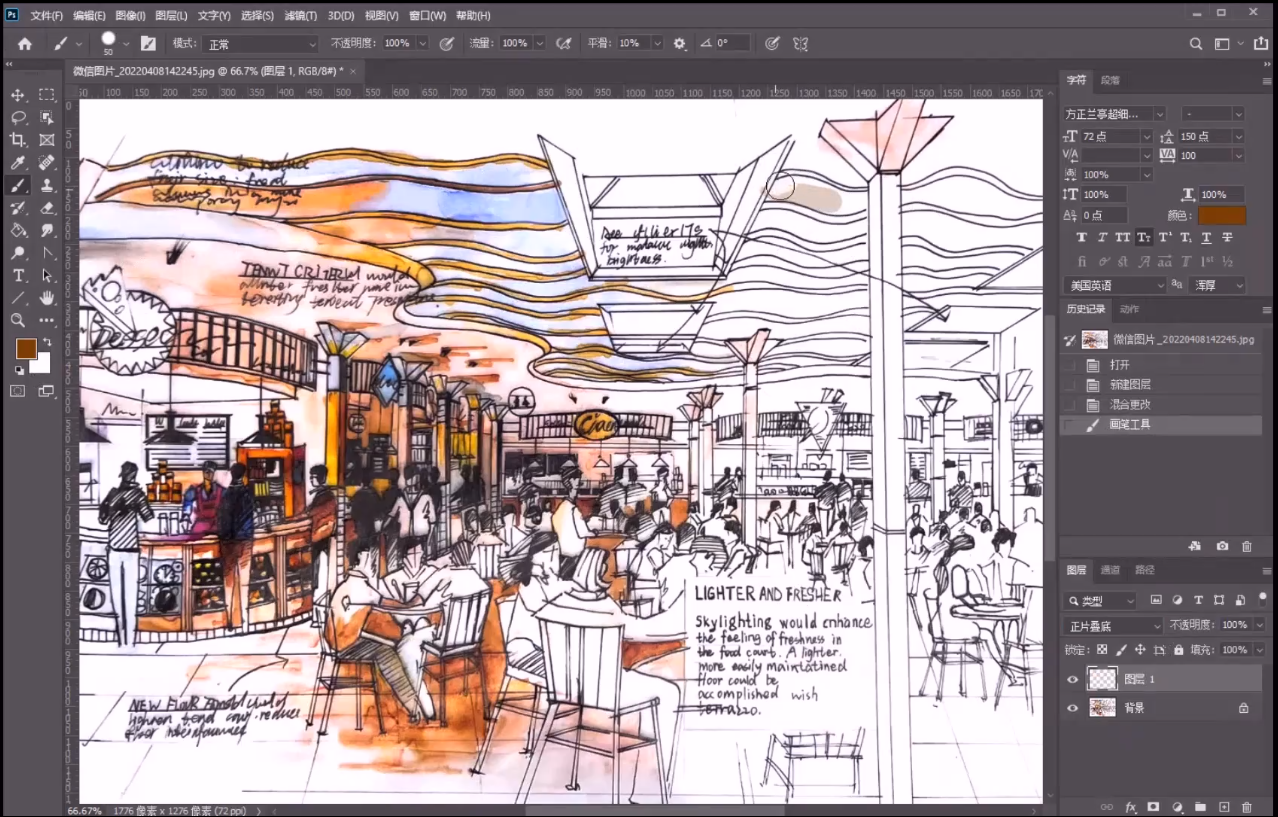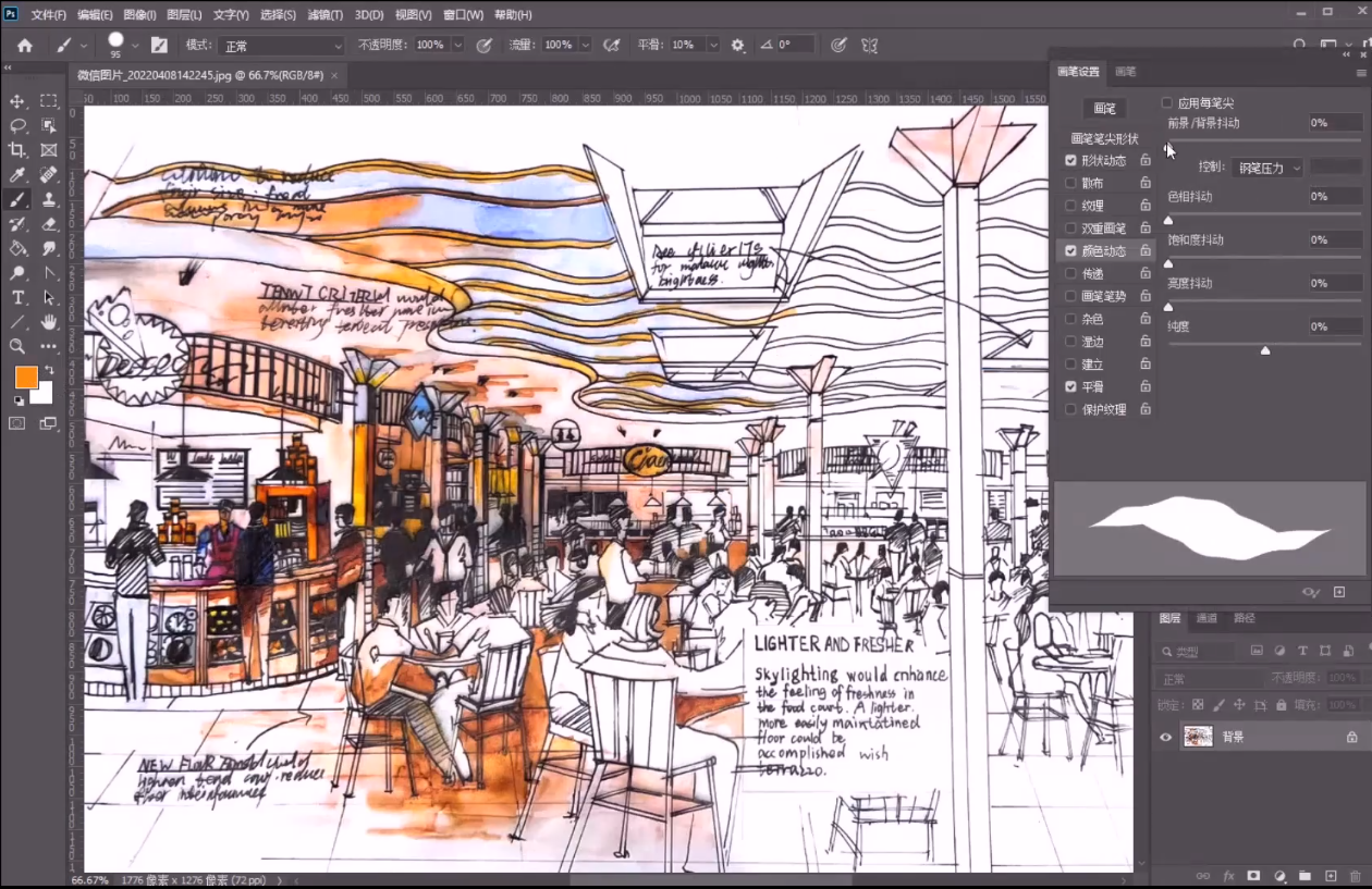 其三也是此次疫情期间最为突出的困难。由于员工无法及时购买补充绘画工具与作画材料,分别存在缺少画材和纸张不足的情况,造成作业完成和提交的困难,将影响到整体教学进度和效果。应对这一在线课程的突发情况,陈老师根据教学经验,要求员工改用电脑完成手绘练习,并在课堂上用数位板结合Photoshop软件,给员工示范了手绘电脑上色的操作步骤,不仅帮助员工复习巩固了已学平面设计软件PS的知识点,而且也拓展了手绘表现的媒介与工具。在当代数字化、无纸化信息时代,电脑手绘效果图是设计师最为重要的设计表达手段之一。由于突破了纸面和实体画材限制,电脑手绘能够产生更为强烈与富有表现力的视觉效果。此次《表现技法》在线课程,从纸面作画过渡到电脑手绘表现,是该课程在内容和方法上应对疫情特殊情况的一次尝试,同时也为该课程结合前沿需求,突破纯纸面表达提供了契机。