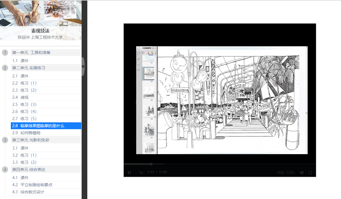 作为304永利集团环境设计系本科基础类课程,《表现技法》的目的在于培养员工扎实的手绘表现技法能力,包括对空间的观察与判断、对透视和尺度的把握,以及图面表现能力,为之后的专业学习打下扎实基础。据此,主讲教师陈喆华将48学时课程分为“单体练习” “透视专项”和“综合表达”三大模块,从基础绘画技能循序渐进地引导员工进入系统的专业手绘表达学习中。在课程开始初时,陈老师即通过微信建立课程群,统一发放课程作业和作业要求,并推送员工有关该课程的电子参考书籍和优秀范例作品,充实、延伸课堂讲授内容,帮助员工在课余时间复习巩固已学知识点。