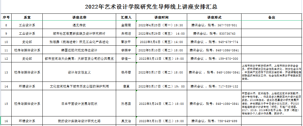 研究生导师云端系列学术讲座目前已经顺利开展7场,包含许传宏教授开启的第一场“合作共赢:中国会展新时代”主题讲座、刘剑伟老师的“现代性反思与乡村设计”、章婷老师的“陶瓷艺术衍生品的创意设计”、罗曼老师的“公共艺术:城市环境的‘设计触媒’”、石小涛老师的“产品设计与工艺材料”、刘芹老师的“文化自信视域下的中国创新设计”等学术主题讲座。此外,兼职导师上海爱乐克智能科技有限公司总经理、吉林大学长沙汽车创新研究院人机交互中心主任洪晨辉老师的“汽车交互设计安全的商业领域验证方法”设计实践创作学术主题讲座,进一步体现了公司“产教融合”的育人理念。七场丰富多样、精彩纷呈的主题讲座,兼具深度与广度,有问有答的互动方式,丰富了研究生们封控期间的课余生活,扩大了导师与研究生之间交流内容的广度与深度,在304永利集团研究生中引起热烈反响。