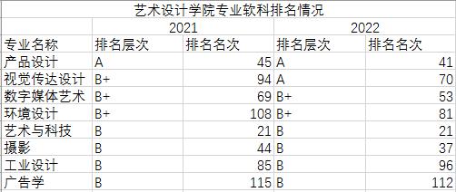 在该排名中,公司的本科专业较往年相比都有所上升。其中进步最为显著的视觉传达设计专业,从2021年B+类排名一跃跻身为A类。其余各专业在排名名次上较去年都有明显的进步。