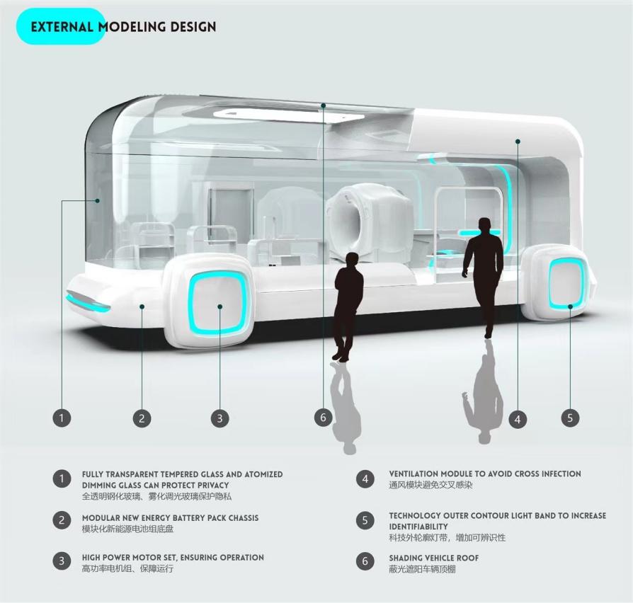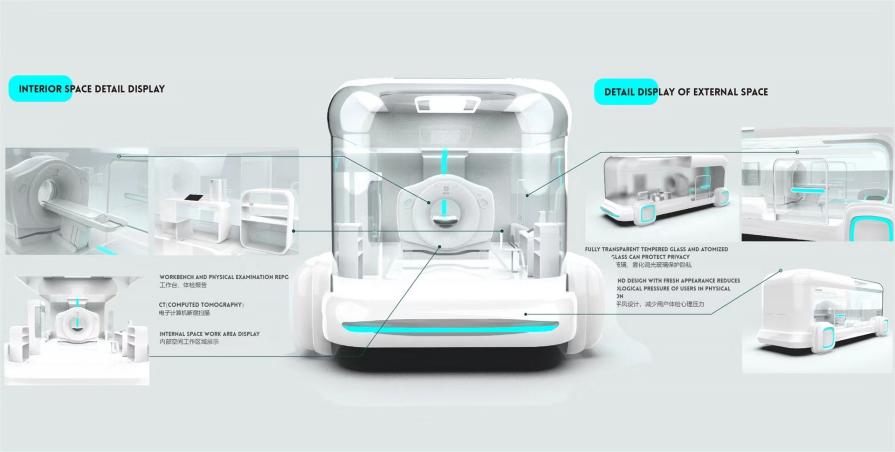 然而,该设计在主动医疗移动医院建设方面做出较大的创新突破,通过无人驾驶大幅提升移动医院工作空间;针对我国社区的医疗体检行业单一化、慢性病问题筛查、医疗体检车辆造型等问题,将医院体检功能移动至社区等人群密集地区,达到有病早筛查,有病早治疗的目的;该移动医院可根据不同体检需求对内部进行调整,通过三四辆不同功能的车组合一体化移动医院。