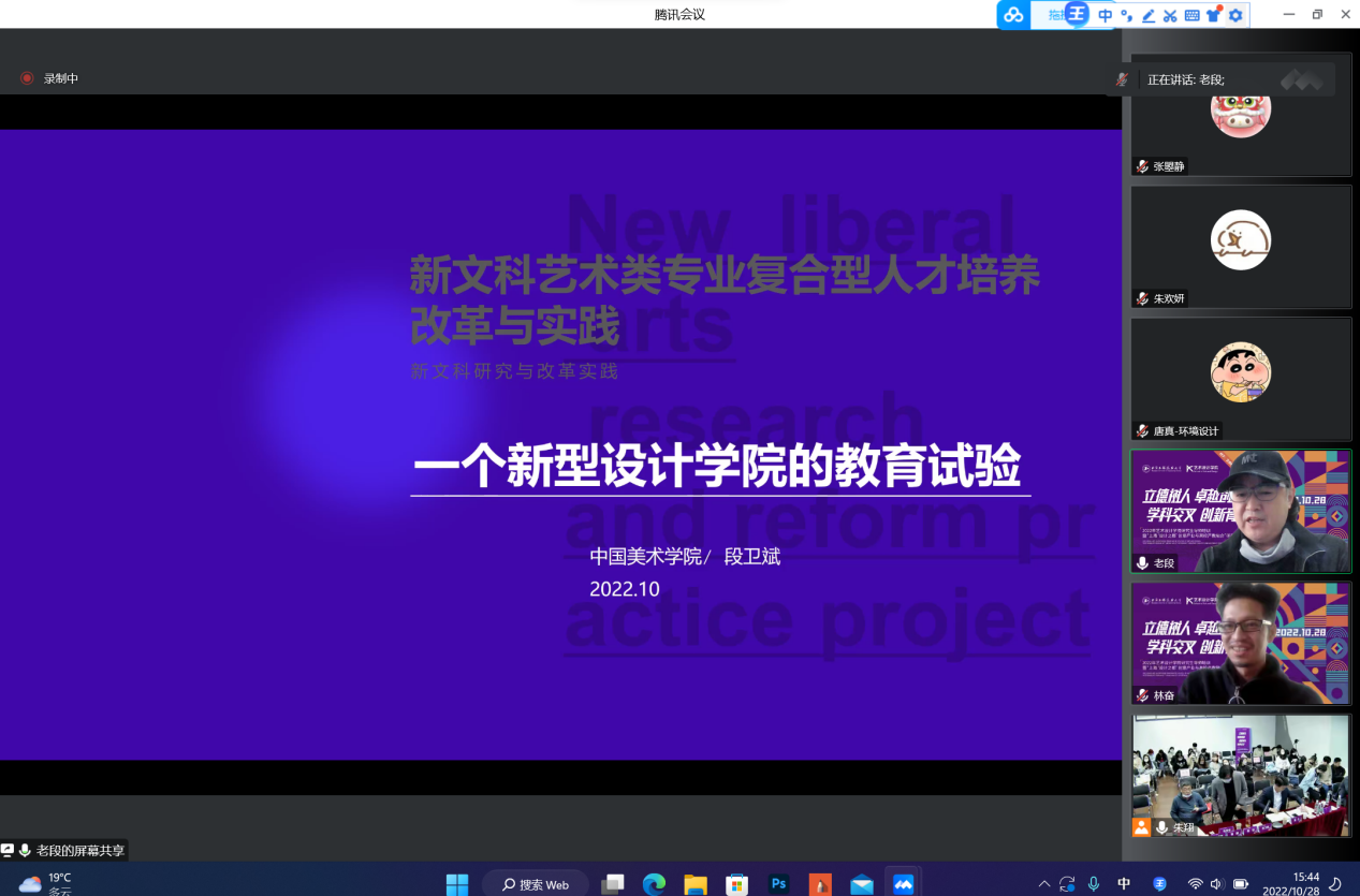 中国工业设计协会常务理事、中国美术公司创新公司经理、博士生导师段卫斌教授《新文科艺术类专业复合型人才培养改革与实践,一个新型设计公司的教育实验》,从自身的项目课题入手,探索了未来的设计、未来的设计学科的发展趋势,从现状、思辨、举措、进行四个部分进行了深入浅出的分析。