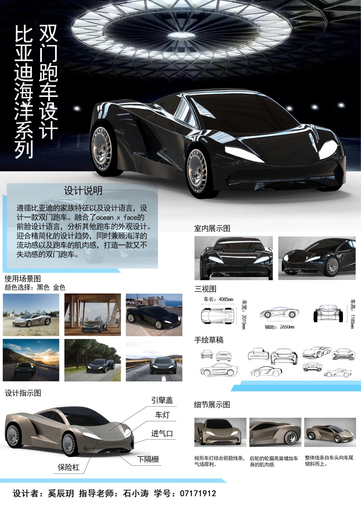 设计说明:遵循比亚迪的家族特征以及设计语言,设计一款双门跑车。融合了ocean x face的前脸设计语言,分析其他跑车的外观设计。迎合精简化的设计趋势,同时兼顾海洋的流动感以及跑车的肌肉感,打造一款又不失动感的双门跑车。