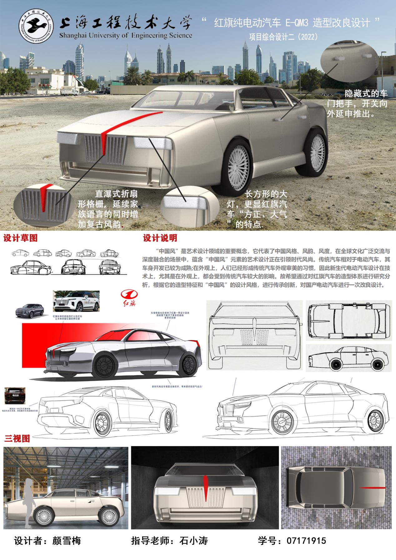 1、作品名称:红旗纯电动汽车E-QM3 造型改良设计