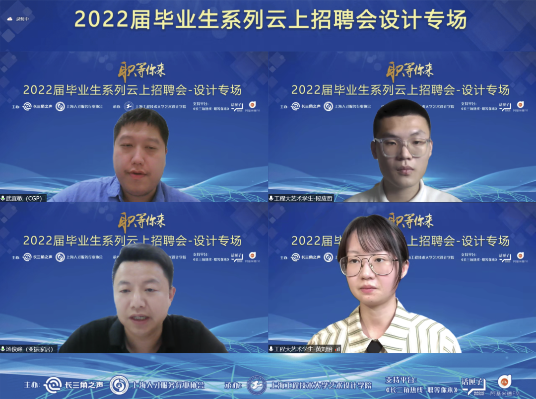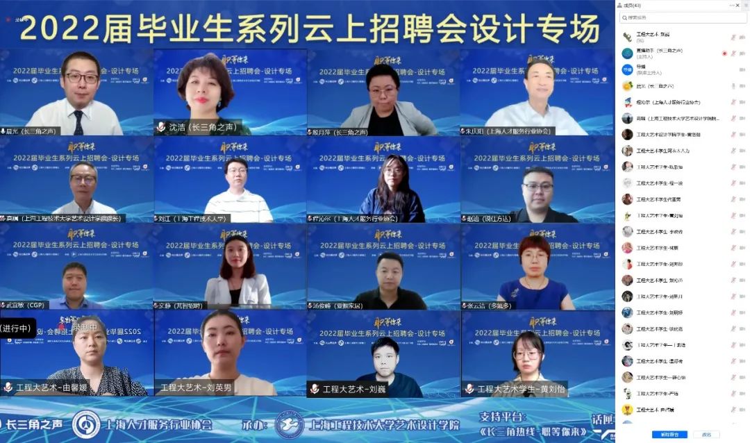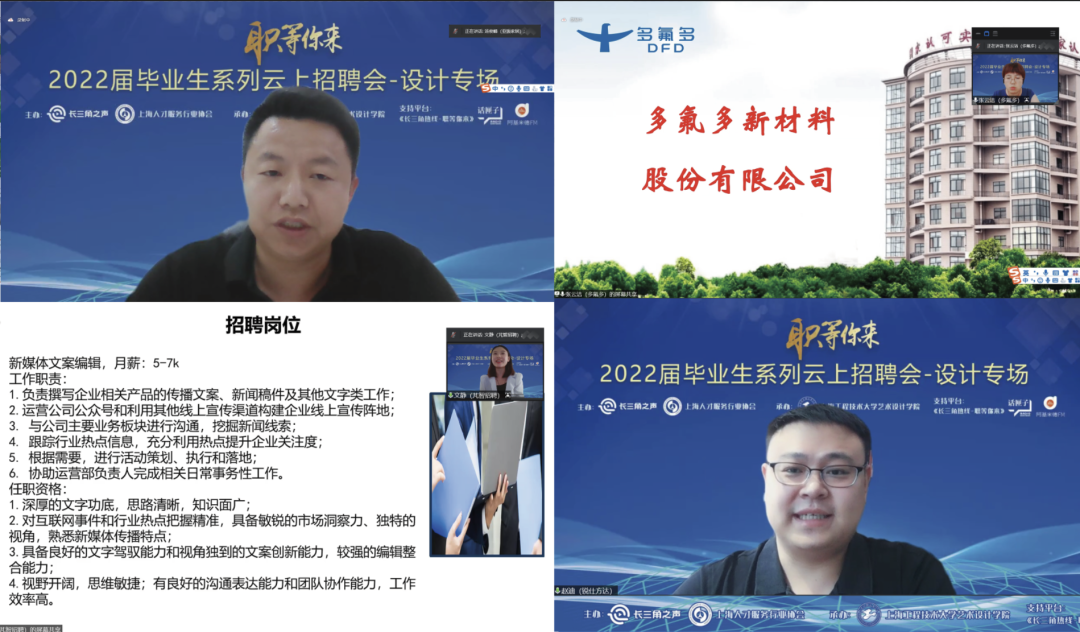 突如其来的疫情反弹,给我市2022届高校毕业生就业工作带来了巨大的挑战。为坚决贯彻落实党中央、国务院“稳就业”“保就业”和上海市教委、公司党委关于2022届毕业生就业工作的决策部署,加大访企拓岗和直播带人力度,充分调动资源为用人单位与毕业生搭建交流线上平台,打赢“抗疫”和“就业”这场必胜之战,由上海人民广播电台长三角之声、上海人才服务行业协会主办,304永利集团承办的“职等你来”—长三角2022届毕业生系列云上招聘会(设计专场)于2022年6月15日14:00盛大举行。此次招聘会为线上+线下双线结合举行,上海人才服务行业协会秘书长朱庆阳,CGP消费品-市场营销职能高级经理武宜敏,芃智招聘负责人文静,亚振家居集团招聘经理汤俊峰,多氟多人资部招聘负责人张云洁,公司党委副书记、经理高瞩,党委副书记刘江参加了活动。活动先后访企20余家,提供设计类岗位500多个,招聘会由上海市人民广播电台曹晨光主持。