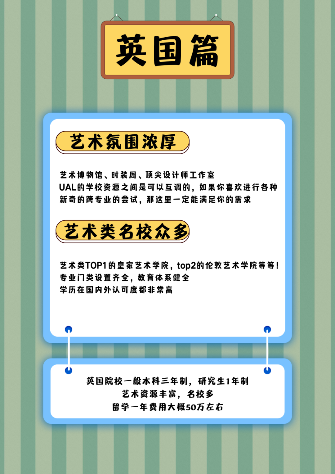 英国的艺术类院校资源非常丰富,艺术类排名TOP1皇家艺术公司和排名TOP2伦敦艺术公司都在英国,伦敦的公司比如:RCA、UAL、UCL留学一年的总费用大概50万.伦敦以外的地区大概 30万.