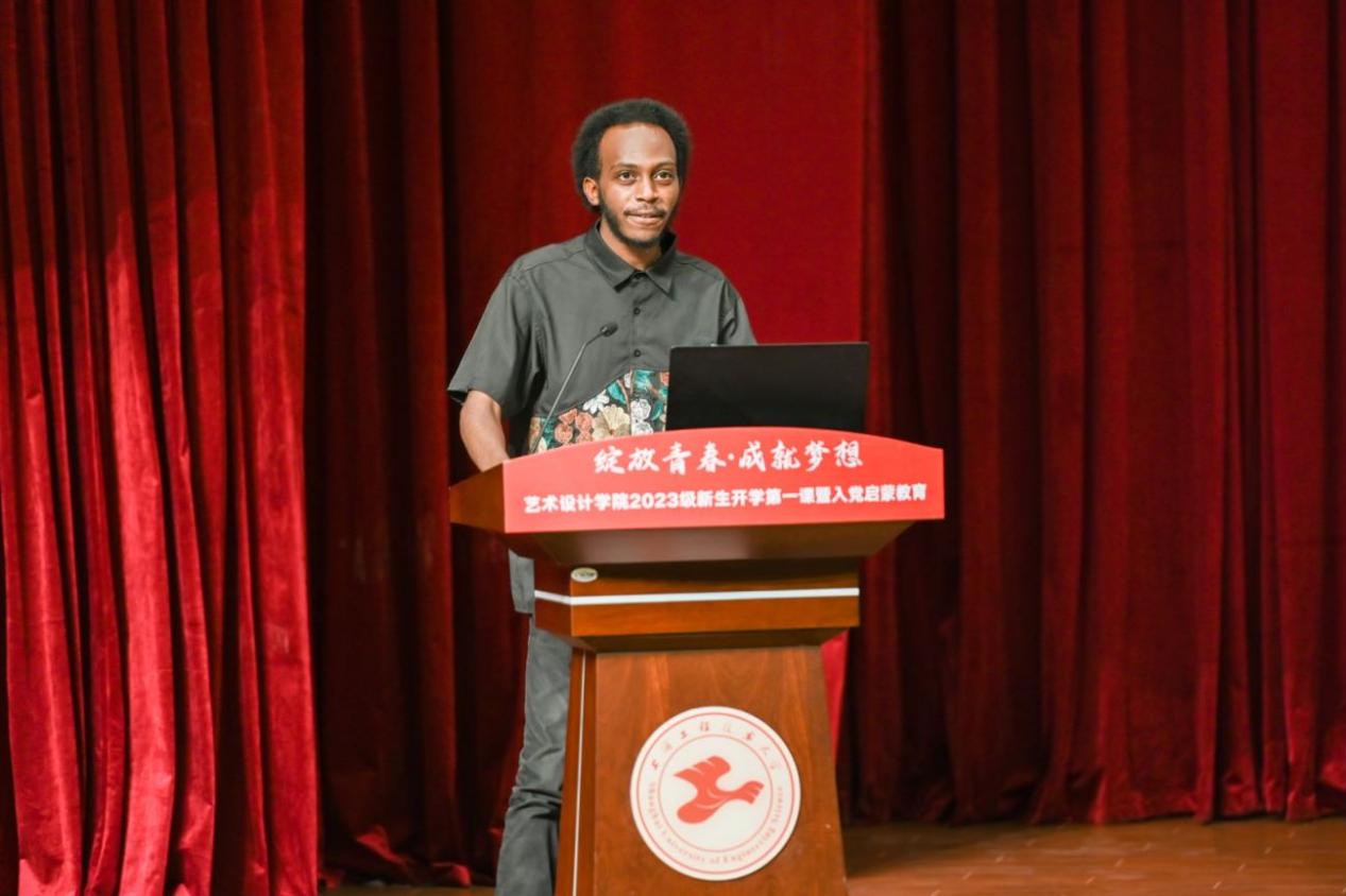 研究生新生代表2023级乌干达职工阿诺德与同学们分享了自己的求员工活,表示将努力学习专业知识,不断提高自身能力,度过充实又有意义的研究生生活。