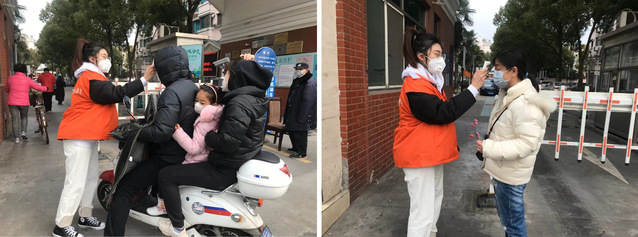 申济豪在上海懿德社区服务中心测量体温(左)、
