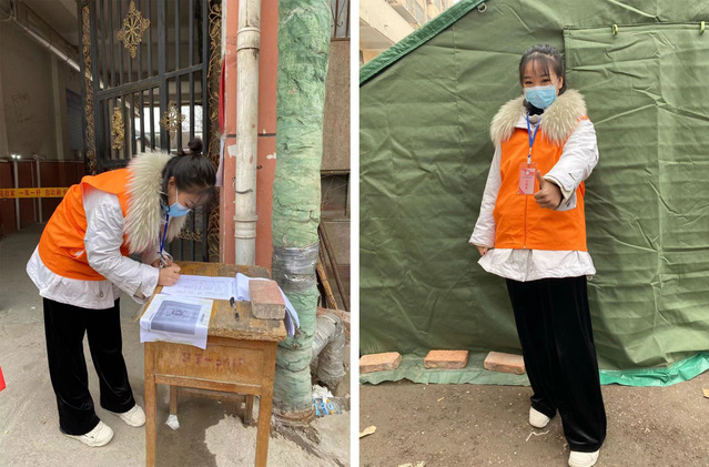 钱嘉琪在上海市闵行区浦江镇的社区街坊进行疫情排查工作