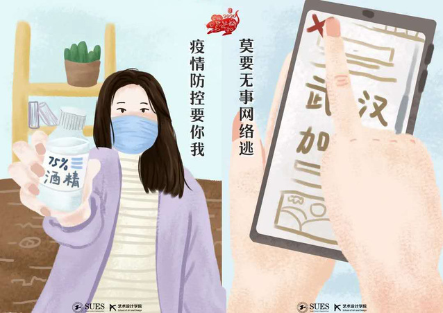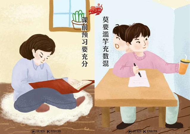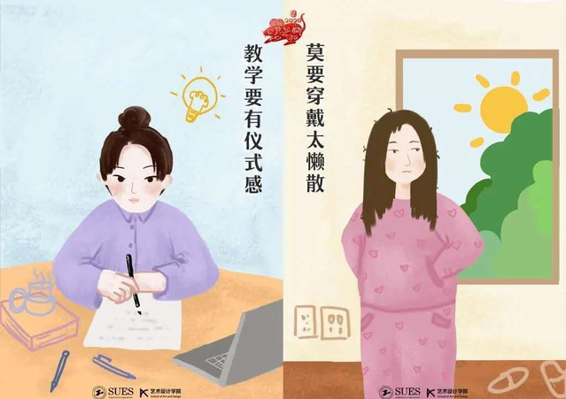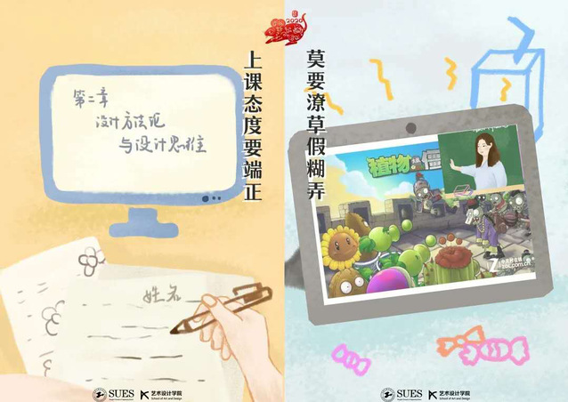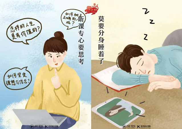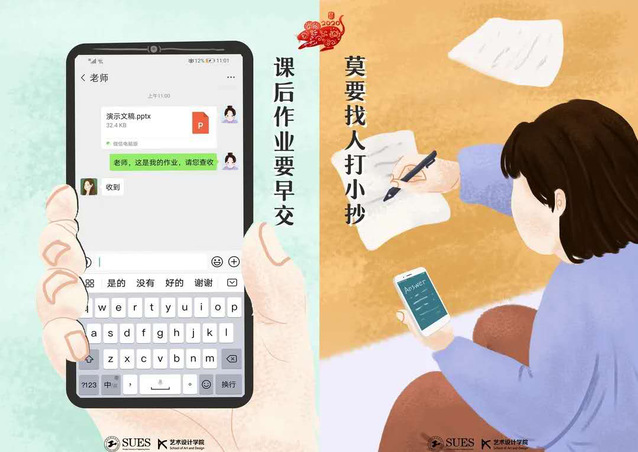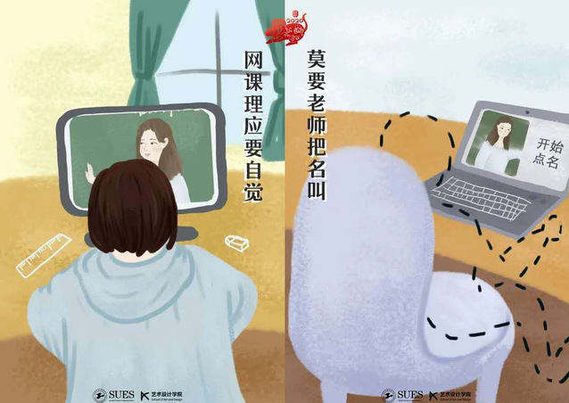 公司利用自身专业优势,以生动、有趣的宣传方式向同学们倡导好的学风,杜绝不良行为。2019级视觉传达设计专业2班王桉妮设计的“网课学习,十要十不要”作品,就起到了很好的宣传效果。