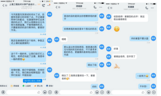 如何使用网上教学平台,是教师的第一大挑战。于是金薇薇老师潜心研究,并与授课班级的班干部以及热心员工一起研讨,确定使用钉钉智能移动办公平台。并且提前两周建立了钉钉上课群以及进行多次平台稳定测试,确保课程的顺利进行。根据网上教学的优势和弊端,她及时调整教学内容和教学形式,最终采用钉钉直播讲授课程理论加视频会议开展课堂讨论以及在线练习点评等多种形式结合的线上教学模式。在授课前,将事先制作的精美PPT,每个章节的教学目的、练习要求发到班级上课群,让每个员工都能对课程有个预先的了解。