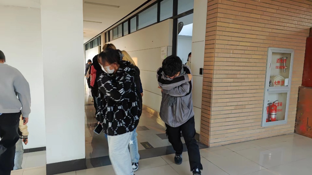 本次消防演练围绕实验室消防安全,设定于艺术楼艺术基础创作实验室(画室)。随着一声警报,演练正式开始。同学们在老师的组织下,手捂口鼻,靠楼道一侧弯腰行进,按照指定的逃生路线有序地撤出实验室,并在指定位置集合,由班长清点人数。