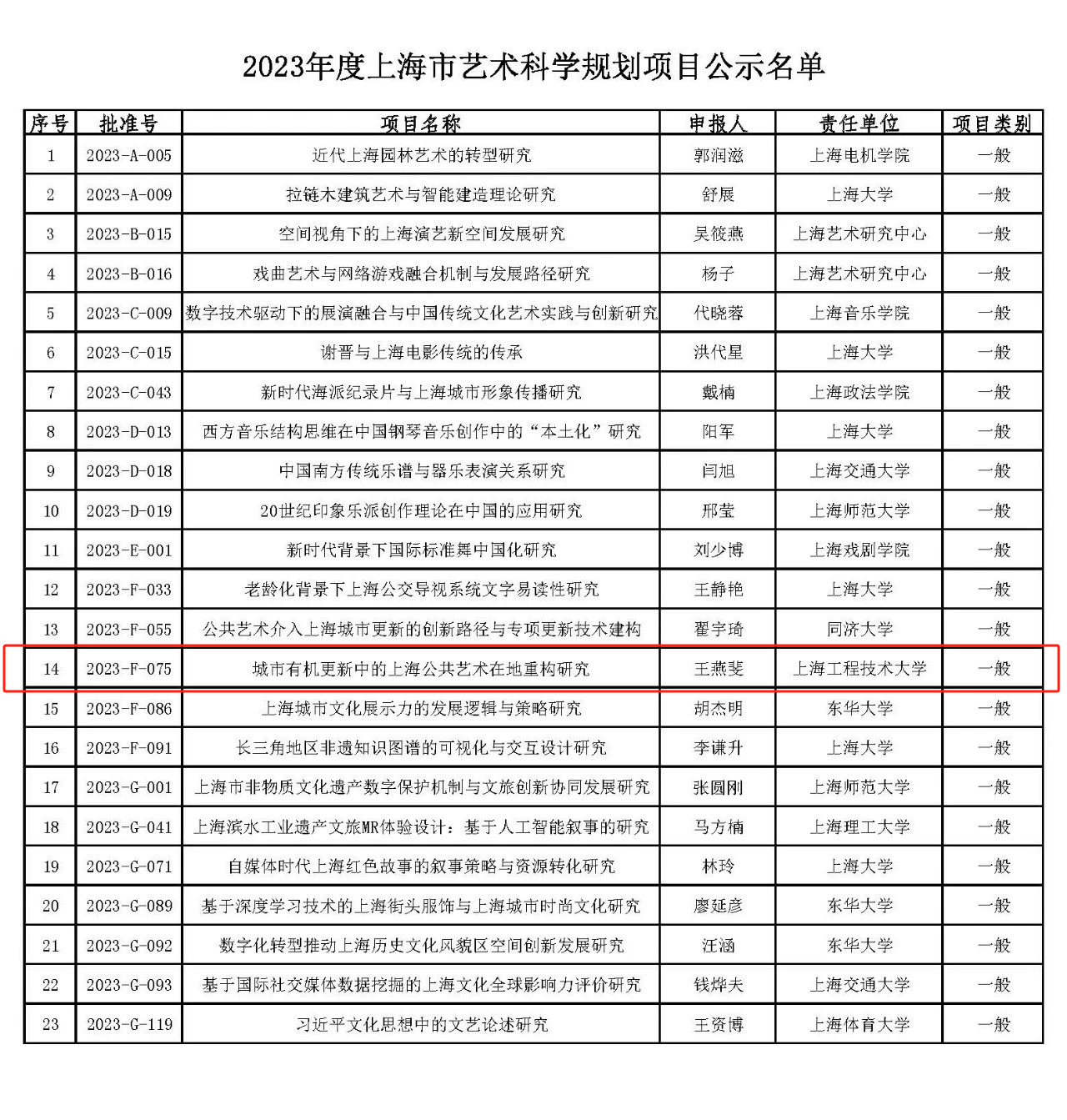 2023年度上海市艺术科学规划项目评审工作于近日完成,公司王燕斐老师的“城市有机更新中的上海公共艺术在地重构研究”获得一般项目立项。