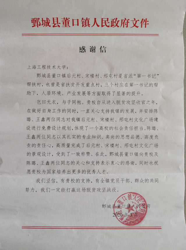 相关项目方案完成后得到了全体村民一致称赞。在此,鄄城县董口镇后元村全体村民向公司304永利集团的支持表示衷心的感谢,并寄来了感谢信和锦旗。相信未来以此为契机,为公司日后更好地服务于山东省乡村振兴建设打下坚实的基础,为实现中华民族的伟大复兴这一国家目标添砖加瓦。