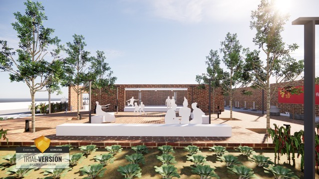 由于疫情期间现场考察受到了限制,设计工作采用QQ会议利用网络采用线上沟通的方式,经过多轮方案反复修改,最终确定以山东当地特色元素“石碾/农具”作为主题的方案作为村文化广场景观设计方案。方案主要采用当地常见的红砖材料作为设计原料,并结合山东当地乡村常见的石碾子和水缸等元素作为设计切入点,并巧妙的使用“水缸蓄水”这一元素反映了习近平总书记提出的“幸福生活是努力奋斗”这一主题,在党的带领全体村民脱贫致富奔小康这一主题;并在广场中心位置设立农具展示区域和党建空间,彰显在习近平主席为核心的党中央国务院的英明领导下改善我国农村基础设施建设所取得的成就,同时显示2020年脱贫攻坚的决心和意志;同时还在广场的周边搭配种植当地特产的蔬菜和花草作为景观小品,增加村文化广场景观设计整体的艺术氛围。效果图如下所示:
