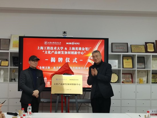On the afternoon of March 14, the unveiling ceremony of the "Cultural Product R&D Collaborative Innovation Center" jointly established by the School of Art and Design and Shanghai Hero Gold Pen Factory was successfully held in Conference Room A412 of the Art Building. Dong Wenbin, Deputy General Manager of Shanghai Hero Group and Chairman of Hero Gold Pen Factory; Li Weifeng, Chairman of Shanghai Yuyi Culture and Art Co., Ltd.; Li Yunxian, Secretary of the Party Committee of the School of Art and Design; Gao Zhu, Dean of the School of Art and Design; and representatives from both the university and the enterprise attended the event. The ceremony was hosted by Xu Jianghua, Vice Dean of the School of Art and Design.