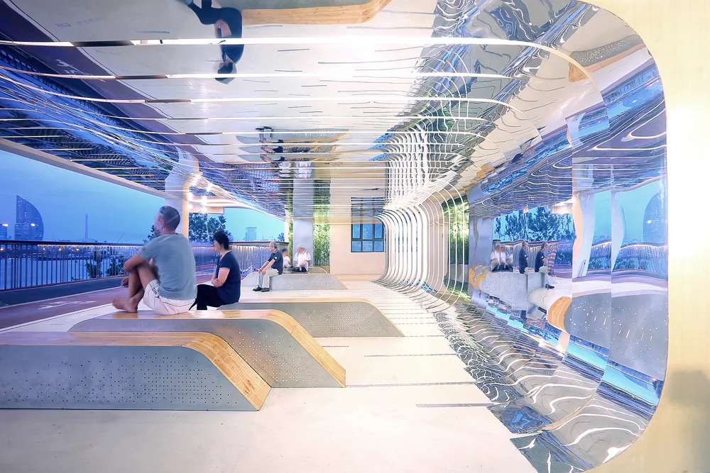 Using the "Mirror of the Huangpu River" project at Qichangzhan as an example, Dr. Sun demonstrated how large-scale mirror materials and fluid curves were employed to merge ceilings, walls, and floors into a cohesive whole, creating a captivating play of light and shadow. During the day, the mirrors enhance the brightness of the space, while at night, the interplay of lighting and reflections fosters an artistic public atmosphere. This space not only provides free drinking water and rest facilities for ferry passengers but also serves as an "urban living room" where citizens can enjoy river views and visual delights.