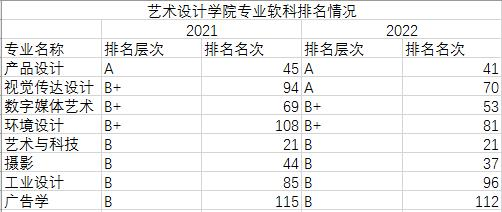 In the 2022 China University Professional Rankings, the 8 undergraduate majors of the School of Art and Design have achieved remarkable results. Among them, 2 majors (product design, visual communication design) were rated as class A, 2 majors (digital media art, environmental design) were rated as class B+, and 4 majors (art and technology, photography, industrial design, advertising) Awarded category B.