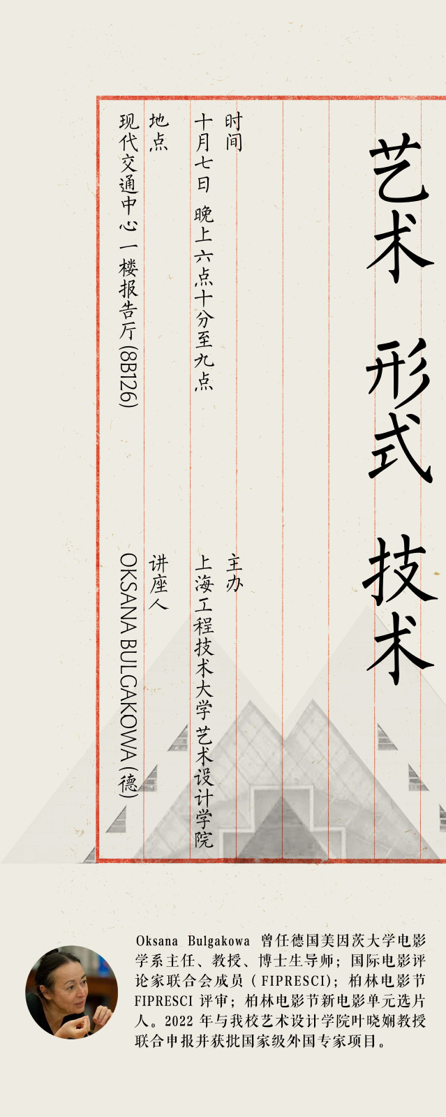 This lecture will explore how amateur enthusiasts and professionals interact with art, as well as the ways in which meaning is generated. Including how we analyze art, the basic principles of formal analysis, the discussion and interpretation of an artwork using different methods, and new analytical methods such as careful reading and computer analysis. The speaker is Professor Oksana Bulgakowa from Germany.