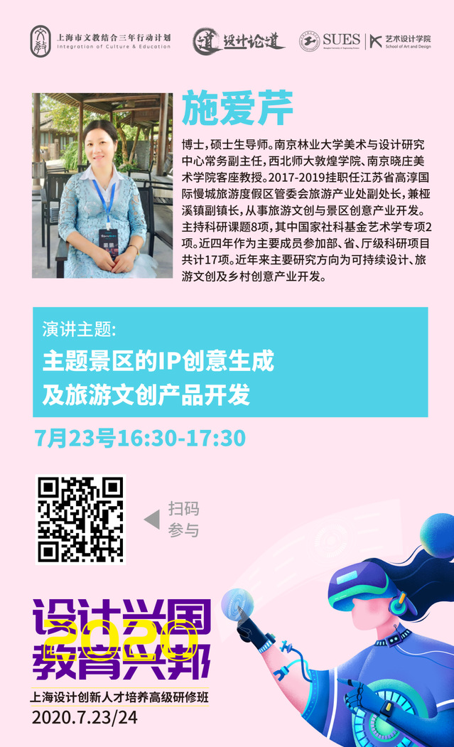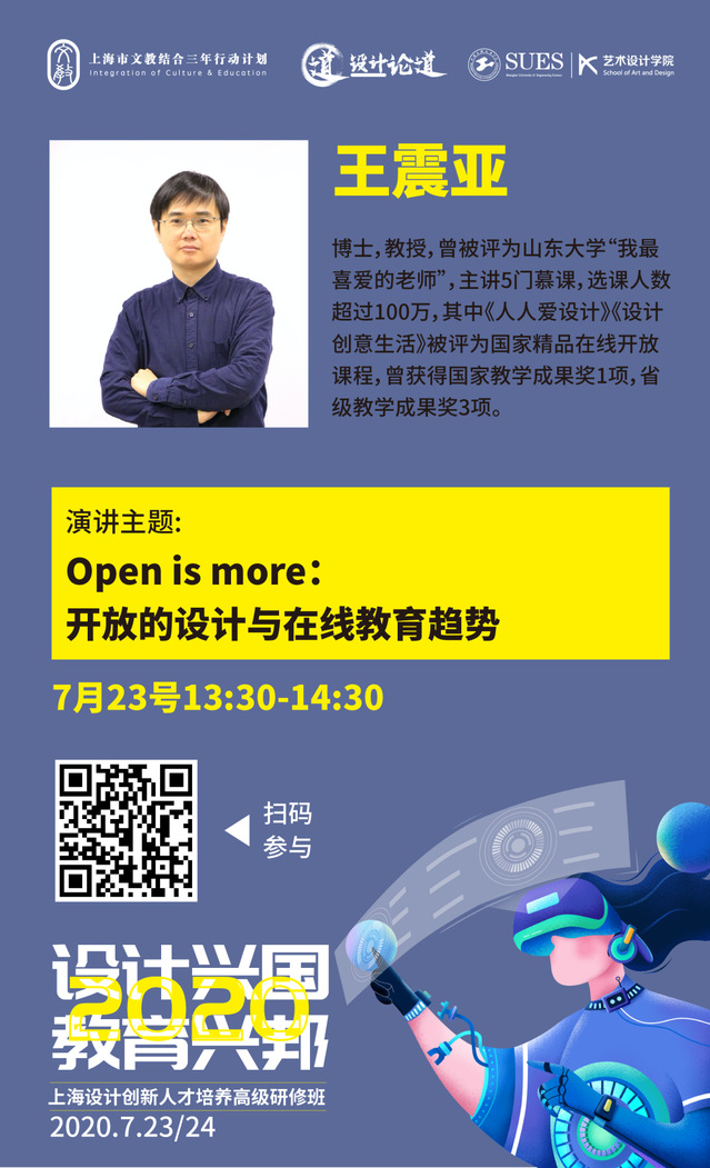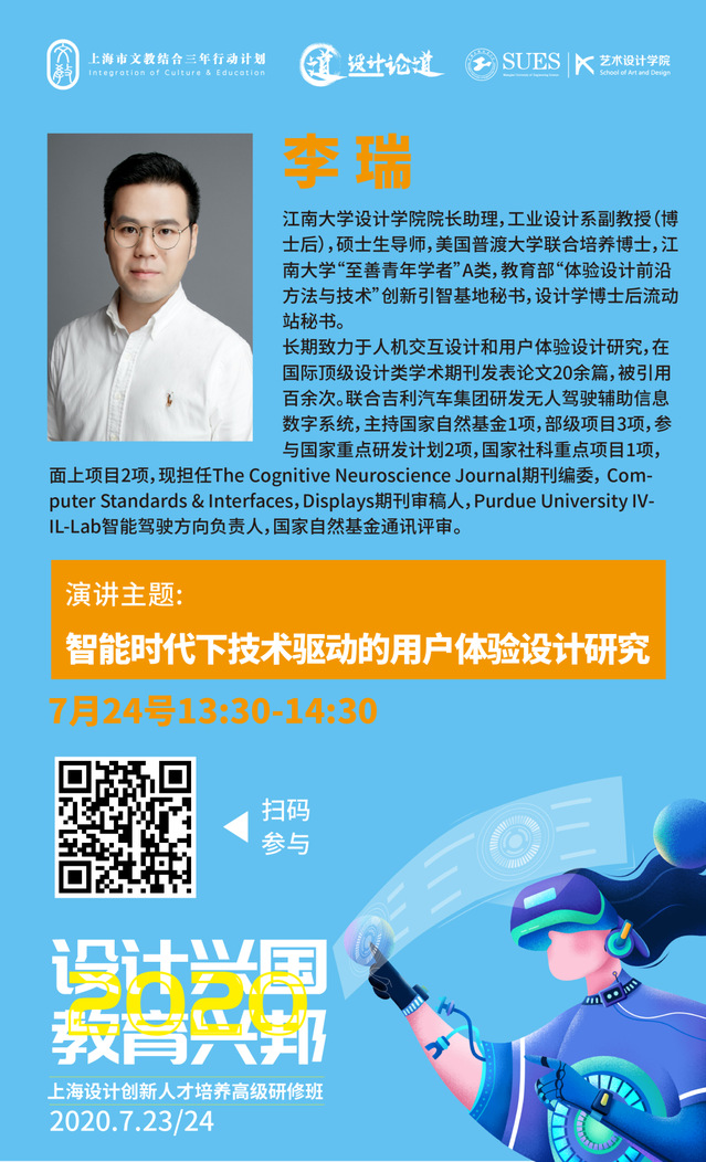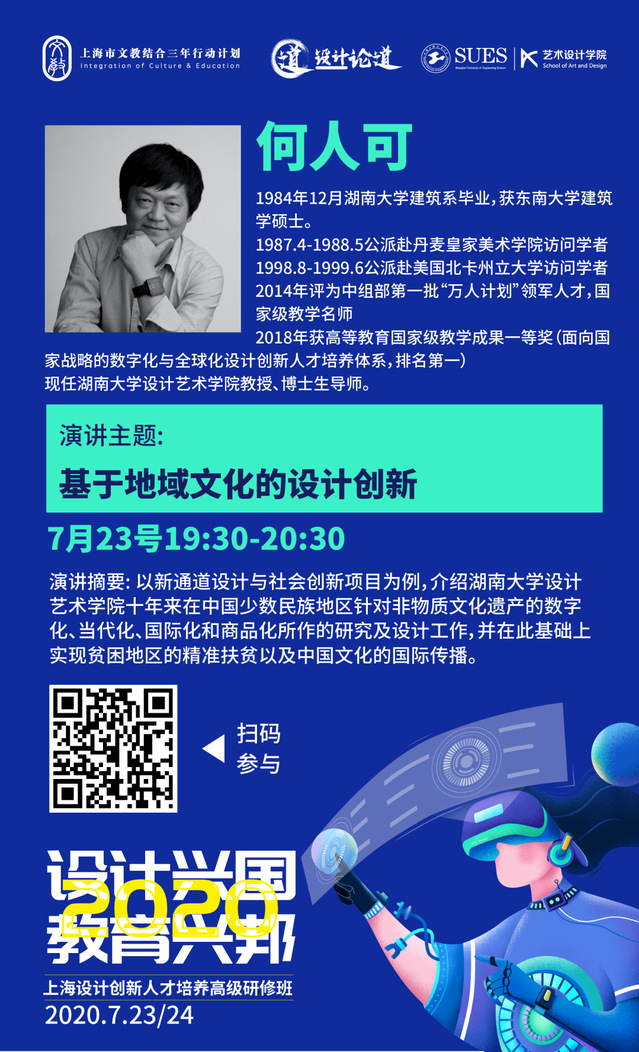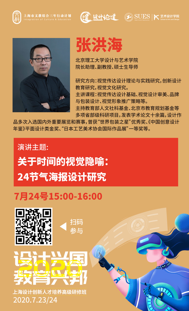 以“设计兴国,教育兴邦”作为上海设计创新人才培养高级研修班的主题,本次人才培养设计创新高级研修班作为”设计论道”系列活动,主要将工业设计、环境设计、视觉传达、数字媒体设计以及设计史论等学术板块融为一体,邀请国内外知名高校的专家学者共聚一堂,历时八个小时的时间,各位专家在线结合当下国内外设计市场的发展趋势,并结合自身设计实践经验,立足于我国高校设计教育现状,共同探讨国内外设计学前沿科技、最新研究成果、未来发展趋势,为各位青年学子和青椒教师未来的学术之路,指明未来努力的方向,同时在炎炎夏日,为各位本科、研究生以及青年教师,奉上清凉舒爽的一场学术盛宴。